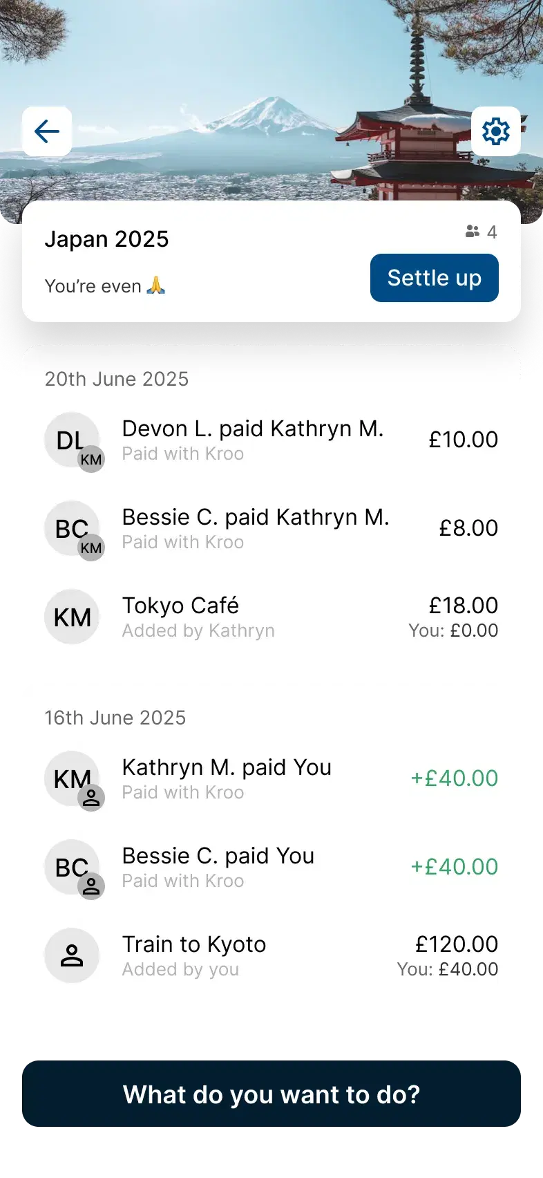 Spend, track and settle up simply. Let the Kroo app handle the maths so you don’t have to.